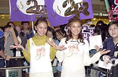 乐坛组合2R两名成员黄婉佩(Race)、黄婉君(Roseane)(左起)11月29日在香港出席香港电台《十大中文金曲选举》之「最有前途新人奖」宣传活动,并向在场歌迷派发投票表格,反应热烈,转眼间已两手空空。中新社记者:邓庆乐