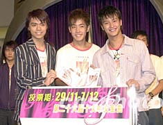 歌星张敬轩、李逸朗、吴浩康(左起)11月29日在香港出席香港电台《十大中文金曲选举》之「最有前途新人奖」宣传活动,三人角逐男新人奖,向在场歌迷自我拉票外,并呼吁歌迷踊跃参与投票。中新社记者:邓庆乐