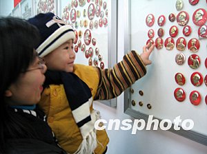 12月6日,山西省集邮协会、山西省集邮公司等在太原市举行“纪念毛泽东诞生一百一十周年”集邮展暨纪念邮票发行式,“文革”时期流行的毛泽东像章令当今的儿童好奇。作者:张云