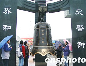 由南京钢铁集团浇铸的“和平大钟”十二月十一日正式落户南京大屠杀遇难同胞纪念馆,以铭记历史教训,祈祷世界和平。大钟高3米,寓意纪念30万遇难同胞;总重量6.6吨,表示大钟于南京大屠杀遇难者66周年祭日铸建;下摆口径为1.937米,意为日军全面侵华及南京大屠杀发生的年份。该钟外形仿明式青铜古钟样式,钟体正面是著名书法家启功书写的“和平大钟”钟名,背面刻有“前事不忘、后事之师,以史为鉴、开创未来”16个大字,两侧分别刻有铭文和浮雕。作者:丁梅