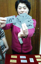 中新网12月16日电(记者甄雪原)在一代伟人毛泽东诞辰一百一十周年之际,北京王府井古人类文化遗址博物馆举办了一个以个人收藏品为主的“历史巨人毛泽东”展。两副由毛泽东不同时期签名而构成牌面的金属扑克牌也现身此展览上,扑克形式新颖,颇为引人关注。