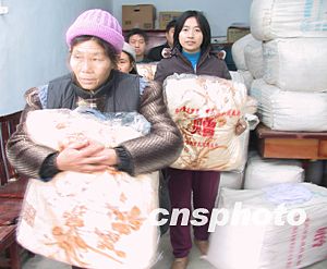 受重庆市开县高桥镇的川东北气矿一矿井天然气“井喷”影响转移的民众,26日领取当地政府发放的救灾物资。作者:邹辉