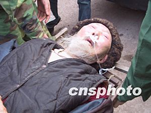 重庆市开县高桥镇的川东北气矿一矿井天然气“井喷”事故受到控制后,医务人员继续救治一受伤老人。作者:邹辉