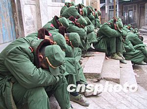 连日参加抢险疲惫不堪的武警官兵在抢险间隙小憩。作者:邹辉