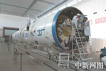 图:"长征二号丙"改进型运载火箭在总装厂房进行系统测试
