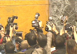 香港知名女星梅艳芳十二月三十日凌晨去世。香港众多媒体到养和医院报道一线消息。(电视截图)