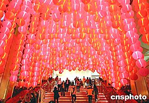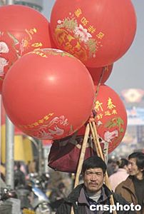 春节临近,江苏走街串巷的货郎趁着年关人们购置年货的机会,扛着高高的气球穿行于街道,等待着买卖的到来。中新社记者:高远