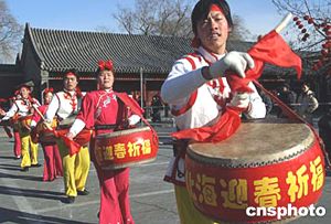 猴年临近,来自河南新乡王官营风雷盘鼓艺术团的团员们二十日在北京北海公园表演盘鼓,营造热烈的佳节气氛。中新社记者:张勤