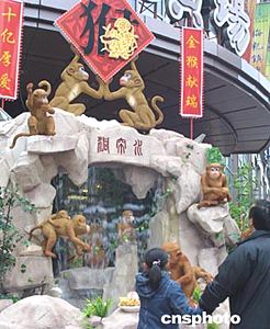 猴年将至,俏皮可爱的“金猴”成为了申城街头迎新贺春的主角。二十日,一组生动活泼的“金猴闹春”贺年景观吸引了不少路人。中新社记者:汤彦俊