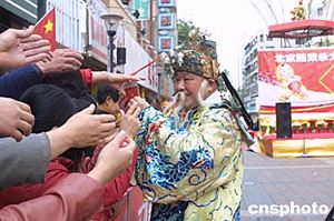 活动中装扮一新的“财神”正给市民和游客派利是(红包)。作者:何雪妍
