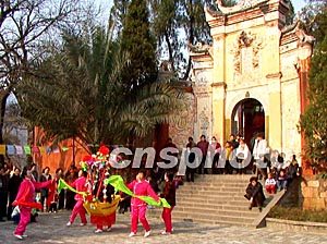 中国农历正月初二,众多三峡移民身穿节日盛装载歌载舞,聚集在白帝城跳秧歌、划彩船,欢度新春佳节。作者:周会