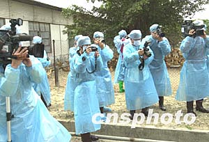 澳门特区民政总署和珠海出入境检验检疫局一日在珠海举行会议,就恢复因禽流感而中断的活鸡输入问题进行协商并达成共识,双方决定报国家有关部门批准后,从三月五日起同步恢复活鸡、冰鲜鸡、和冻鸡的供应。图为前往珠海养鸡场采访的众媒体记者们为确保鸡只的健康,也不得不穿上隔离防护服工作。作者:李刚