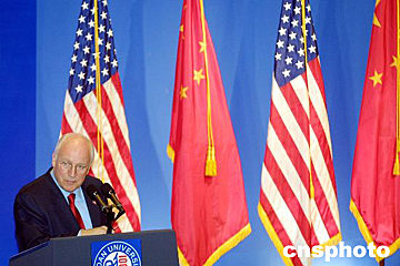 切尼说,中国是美国在世界上的第三大贸易伙伴,两国每年的贸易额达一千八百亿美元。美国从中国购买大量中国制造的产品,同时也向中国出售美国的产品和服务,包括农产品。他说,现在,总量为八千五百亿美元的世界贸易中,有超过百分之五来自中国。中国与美国的双向贸易仅在过去十二年中就增长了七倍。