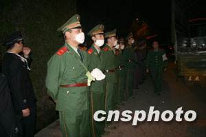 戴着口罩的武警战士整齐列队等待命令。十五日晚,重庆天原化工总厂发生氯气泄漏事故,有十五万人撤离。作者:邹辉