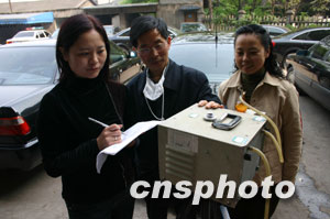 重庆市环保局局长张绍志正在事故现场监测空气质量。十五日晚,重庆市天原化工总厂厂发生氯气泄漏事故,有十五万人撤离。作者:邹辉