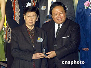 香港民政事务局局长何志平4月27日晚上在香港出席尖沙咀海滨长廊香港“星光大道”开幕典礼,并于开幕典礼中致送纪念品予获嘉许之已故电影工作者家属代表。图为梅艳芳之母亲接受何志平局长颁赠纪念品。作者:邓庆乐