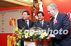 4月28日,2004-05CBA联赛商务推介会在北京举行,这个赛季的比赛将在赛制和招商模式上进行重大改革:南北分区的新赛制、公开透明的招商模式、为球迷、赞助商和媒体服务。图为篮管中心主任李元伟(左一)与嘉宾共同开启新赛季南北双方参赛队伍。中新社记者:盛佳鹏
