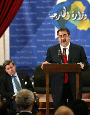 伊拉克临时政府外交部长兹巴里则(右)在权力移交仪式上发表讲话