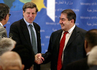 移交仪式结束后,伊拉克临时政府外长兹巴里(右)与美驻伊最高文职行政长官布雷默握手。