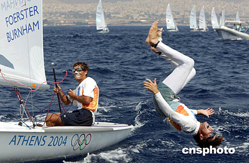 图为英国选手保罗-福尔斯特(Paul Foerster)和凯文-豪尔(Kevin Hall)在勇夺男子"470"型帆板比赛后庆祝的场面。