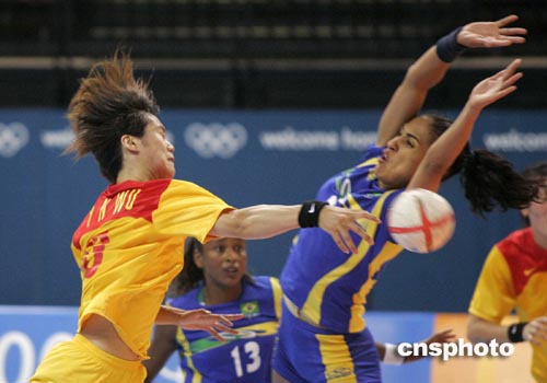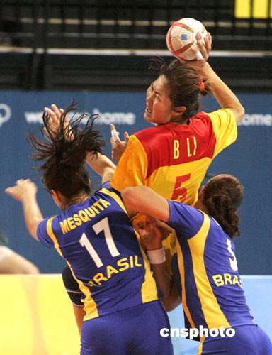 当地时间8月23日下午,在雅典奥运女子手球比赛中,中国女子手球队(黄)以28比23力克巴西队。中新社记者:张炜
