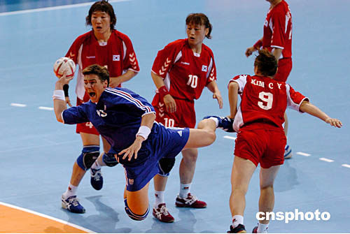 图为在当地时间8月23日举行的女子手球比赛中,法国队的Isabelle Wendling射门的镜头
