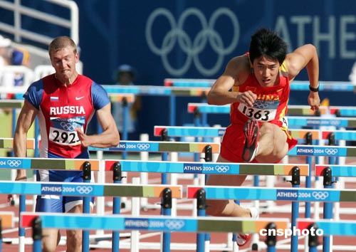 当地时间八月二十四日,中国著名田径选手刘翔(右)亮相雅典奥运赛场,在男子一百一十米跨栏预赛中,以十三秒二七的成绩名列小组第一进入第二轮预赛。中新社记者:毛建军