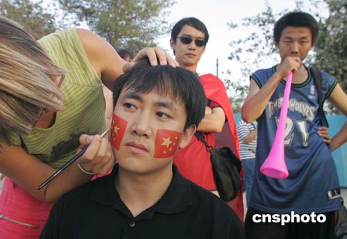 当地时间八月二十六日,一名来自北京的球迷正在雅典排球比赛馆附近请人在脸上手绘五星红旗。雅典奥运会各项赛事接近尾声,大批来自中国国内的奥运助威团仍活跃在各比赛场馆。中新社记者:张炜