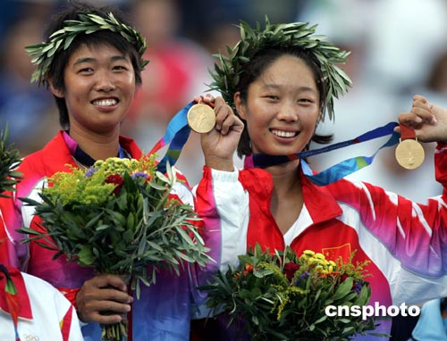 雅典时间8月22日傍晚,中国网球选手孙甜甜、李婷(左)在奥运会女子双打决赛中以二比零战胜西班牙选手,令人震惊地获得冠军。中新社记者:任晨鸣
