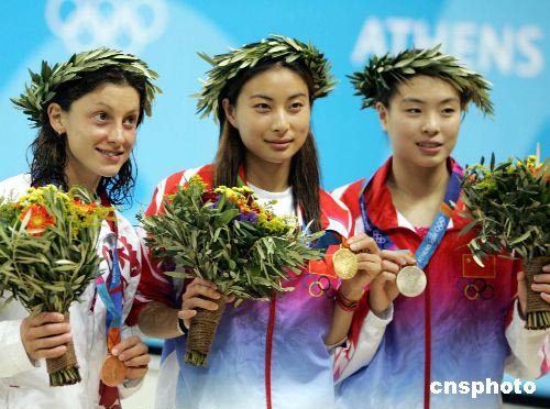 当地时间8月26日晚,雅典奥运会跳水比赛继续进行,中国选手郭晶晶、吴敏霞力压群芳,包揽金银牌,俄罗斯选手获得铜牌。中新社记者:任晨鸣