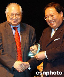 香港民政事务局局长何志平向出席座谈会的演讲嘉宾胡应湘及胡汉清、陈弘毅、邵善波分别赠送纪念品。中新社记者:钱兴强