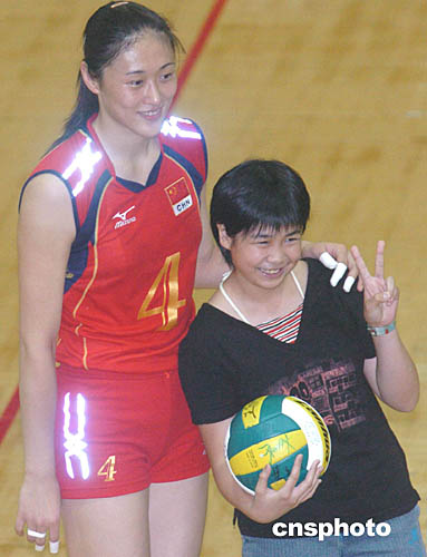 一位十来岁的小“帅哥”出场,点名刘亚男发球。靓丽的刘亚男果然心肠好,她把排球轻轻地抛过网,小“帅哥”一下垫过网,高兴得搂住“美女”拍照,在人们羡慕的呼叫声中接过那只贵重无比的签名排球。