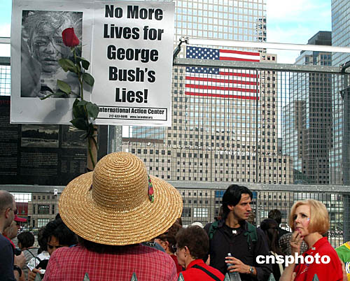今天上午,纽约世贸遗址举行隆重仪式,纪念“九一一”事件三周年。一位反政府人士在世贸遗址的铁栅栏外打起标语,上书:“别再为布什的谎言牺牲更多生命”,表达反对美国攻打伊拉克的立场。作者: