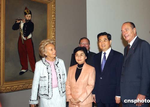 中新社北京十月十日电(记者李静)“法国印象派珍品展”今天在中国美术馆开幕,中国国家主席胡锦涛和在华访问的法国总统希拉克,以及两国元首的夫人一道观看了画展,法国奥赛博物馆馆长乐莫瓦纳兼任全程解说。