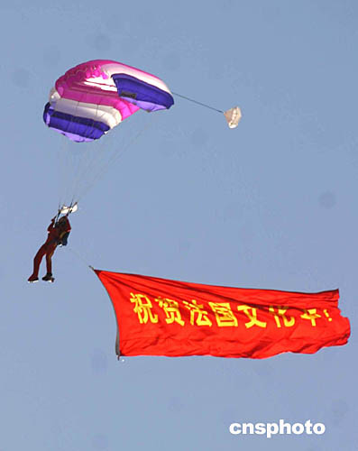 十月十一日,为祝贺法国文化年在中国举行,中国人民解放军空军在法国空军“法兰西巡逻兵”飞行表演后,进行了跳伞表演。图为跳伞队员在空中打开醒目的标语。中新社记者:张勤