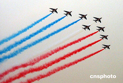 法国空军“法兰西巡逻兵”是当今世界著名的五大特技飞行表演队之一,与英国的“红箭”、意大利的“三色箭”并称为“欧洲三杰”。本次该飞行表演队随法国总统希拉克首次来华访问,作为在中国举办的法国文化年重要活动内容之一,定在北京、武汉、香港和珠海四个城市进行飞行表演。此前,饱受天气困扰的“法兰西巡逻兵”直至本月十一日才在北京进行首演。