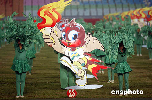 农运会吉祥物“园园”(只向前飞奔的小燕子,高擎熊熊燃烧的农运会圣火,瞬间化作富有动感和张力的“5”的造型)成为开幕式上的主角。中新社记者:盛佳鹏