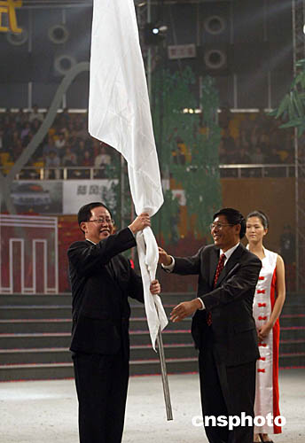 十月二十四日晚,全国第五届农民运动会盛大的闭幕式在江西省宜春市中心体育馆举行,在闭幕式上举行了农民运动会会旗交接仪式,第六届农民运动会的主办城市福建泉州接过农运会会旗。中新社记者:盛佳鹏