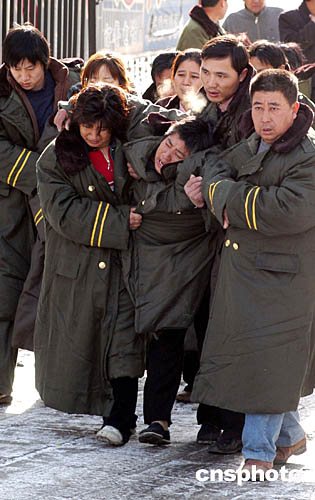 11月24日,包头空难遇难者家属踏雪前往飞机失事地点吊唁亲人,返回时悲伤不已。中新社记者:张宇