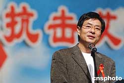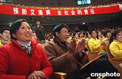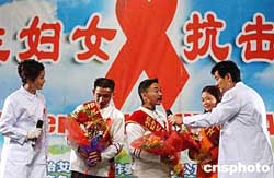 十二月一日,中国内地演员濮存昕(右一)、蒋雯丽(左一)在“关注妇女,抗击艾滋”活动上,与来自四川资中公民镇的艾滋病毒携带者同台献艺,该艾滋剧团是由四川资中县近二十名艾滋病感染者自发组建的。作者:韩艺冰