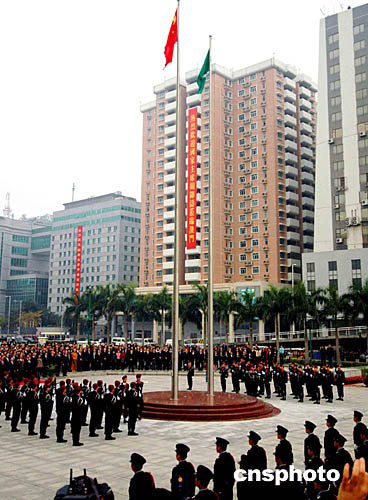 澳门特别行政区行政长官何厚铧、解放军驻澳门部队司令员刘联华20日上午出席庄严的升旗仪式,庆祝澳门回归祖国五周年。作者:宋吉河