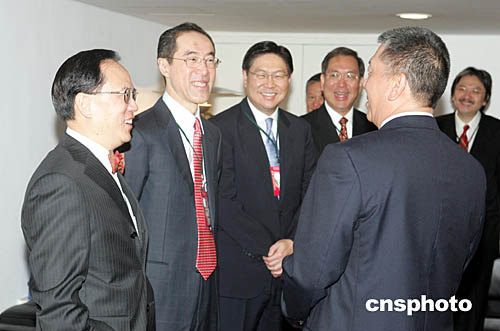 十二月二十日上午,澳门特首何厚铧与前来出席澳门回归五周年大会的曾荫权等香港政府官员交谈。作者:宗金柱