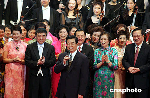 十二月二十日上午,国家主席胡锦涛在澳门文化中心观看了庆祝回归五周年文艺演出后,上台与演员们握手并表示感谢。作者:宗金柱