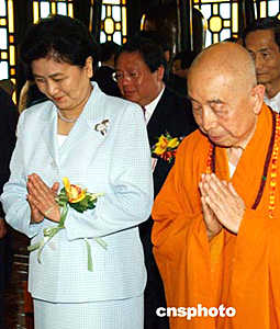 全国政协副主席、中共中央统战部部长刘延东五月二十七日来到香港观宗寺参观,在大雄宝殿与觉光法师一起向释迦牟尼佛像三味讯礼。作者:钱兴强