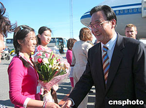 全国人大常委会委员长吴邦国五月三十一日飞抵丹麦首都哥本哈根,一名高中女留学生向吴邦国委员长献花。作者:戴亚平