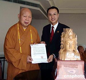 31日,中国佛协会长一诚长老(左)接受香港佛教文化产业总经理吴达镕代表赠送的珍贵观音头象,并应聘为香港佛教文化产业永远荣誉顾问。作者:中新社