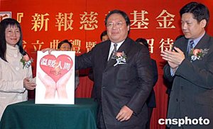 《新报慈善基金》成立典礼暨记者会6月3日在香港举行,民政事务局局长何志平担任主礼嘉宾,并与新报社长杨金权(右)及新报行政总裁叶玲主持《新报慈善基金》成立仪式。作者:邓庆乐