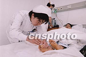 在阿富汗恐怖袭击事件中受伤回国治疗的四名中国工人住进山东省立医院后,受到了医护人员无微不至的关怀。图为山东省立医院护士在为伤员席守忠修剪脚趾甲。中新社记者:张伟