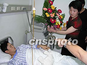 六月十六日中午 ,江西省广丰县政府一行六人专程赴济慰问正在山东省立医院接受救治的在阿受伤工人。图为广丰县副县长祝美清(持花者)在看望受伤的江西籍工人徐启松。作者:胡洪林
