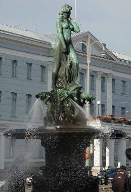在赫尔辛基,提起阿曼达可谓无人不知。阿曼达青铜像矗立在赫尔辛基市中心南码头广场上的圆形喷池中,由19世纪初的芬兰著名雕塑家维莱·瓦尔格伦所创作。1877年,22岁的瓦尔格伦来到巴黎深造,并在这里生活了36年之久。身在异国他乡的瓦尔格伦一直怀念祖国,而这种眷恋之情也在他的作品中得以充分反映。1905年,瓦尔格伦以一位在巴黎留学的芬兰少女为模特,雕塑出阿曼达的裸体青铜像。可当阿曼达铜像在赫尔辛基市中心出现时,立即遭到众多保守者的极力反对。但是,阿曼达面向大海,一手托腮,静静地凝望着芬兰湾的温柔神态和优美动人的线条,栩栩如生地表现了一位清纯少女的自然美,从而赢得了大学生的喜爱。在他们的保护下,阿曼达塑像得以保留在南码头广场。如今,这座铜像广受市民的欢迎,阿曼达更被人们誉为“大海女神”。而每年4月30日的大学生戴帽节,赫尔辛基市中心南码头广场上聚集了成千上万的年轻人,为阿曼达举行戴帽仪式。
